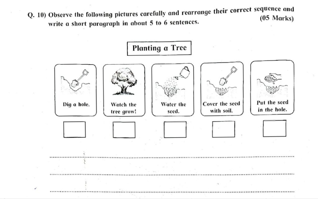 1. Dig a hole. 2. Put the seed in the hole. 3. Cover the seed with soil. 4. Water the seed. 5. Watch the tree grow!