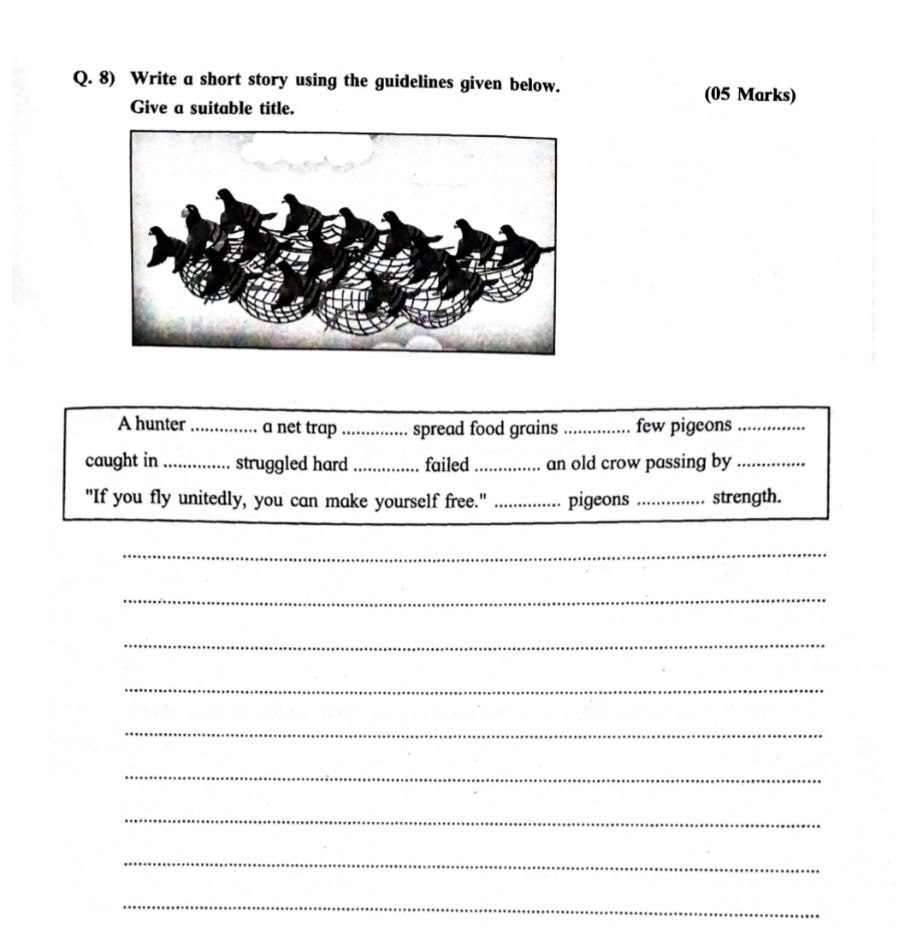 A hunter once set a net trap in the forest and spread food grains to catch pigeons. Several pigeons, landed to eat the grains and were caught in the trap. They struggled hard to free themselves but failed. Just then, an old crow flying by stopped to watch their plight. The crow said, “If you fly unitedly, you can make yourselves free.” Encouraged by the wise crow’s advice, the pigeons decided to work together. Using their collective strength, they flew in unison, carrying the net with them, and escaped to safety.